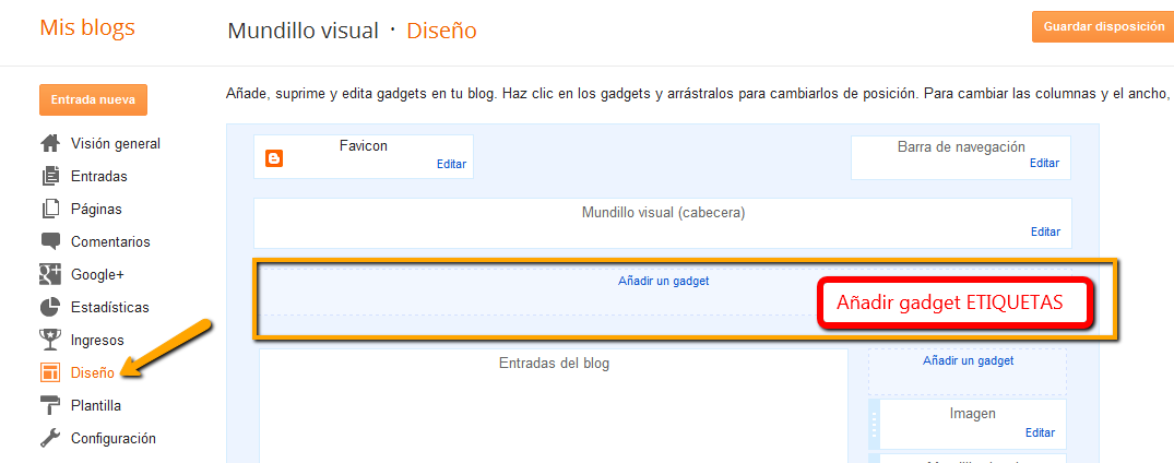 1. Añade el gadgets ETIQUETAS en la cabecera de tu blog