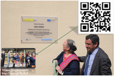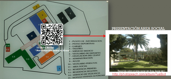 Presentación del Área social del CrmfSf http://photopeach.com/album/7ua9yd Podríamos colocar códigos QR en el plano del CRMF-San Fernando y en su página web, para que enlacen con vídeos, presentaciones, documentos de voz, texto, etc. y expliquen o presenten las diferentes dependencias. Esta información sería de gran utilizar para el alumnado de nuevo ingreso y los nuevos trabajadores del Centro, que a modo de guía turística podrían conocer el Centro antes de su incorporación.