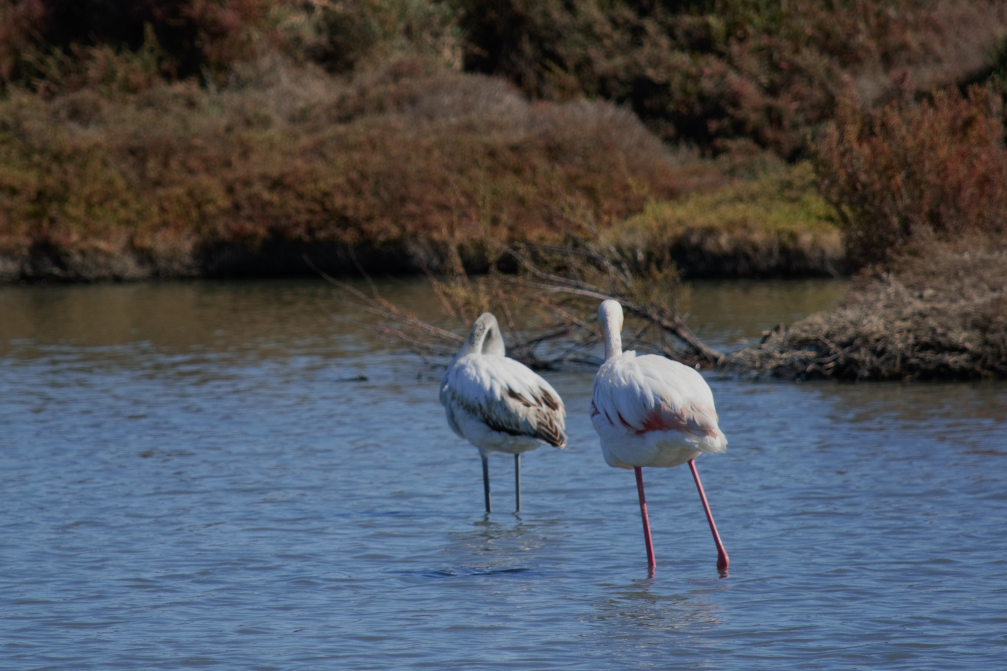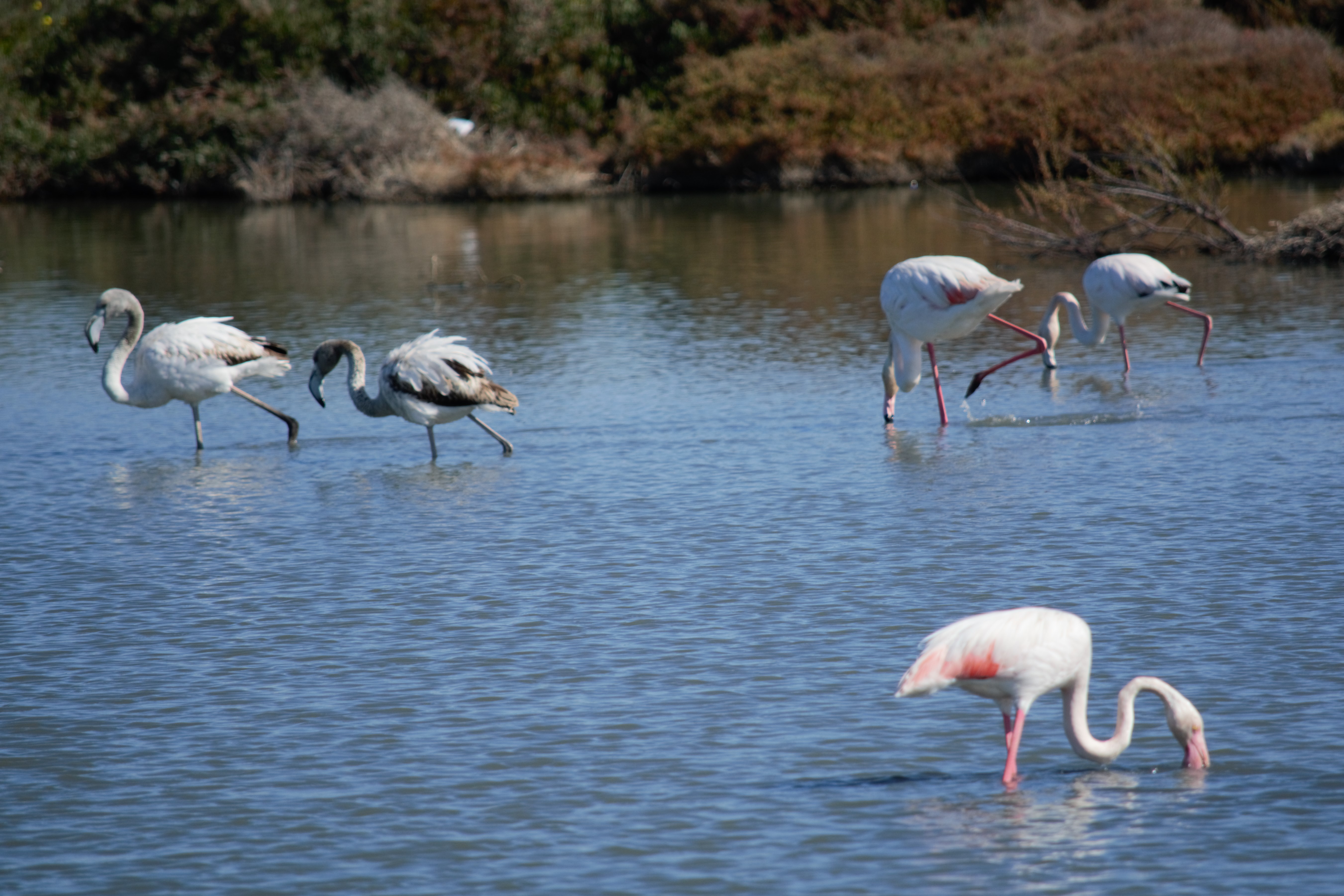 El flamenco común (Phoenicopterus roseus) es una de las aves más espectaculares que podemos avistar en el Parque Natural Bahía de Cádiz. Cuando paseamos por los senderos que discurren alrededor de los humedales (esteros, lagunas y marismas) de San Fernando y Chiclana, un motivo de gran alegría es ver el horizonte lejano teñido de toques rosados. A veces tenemos suerte y esas pinceladas de color rosa proceden de alguna laguna próxima a nuestro camino, en ese caso es fantástico poder apreciar de cerca los flamencos con sus larguísimas y finas patas, sus grandes picos y sus preciosos colores que quedan al descubierto cuando abren sus alas. En esos momentos puedo decir sin error a equivocarme que «La naturaleza enamora mi cámara» 😉