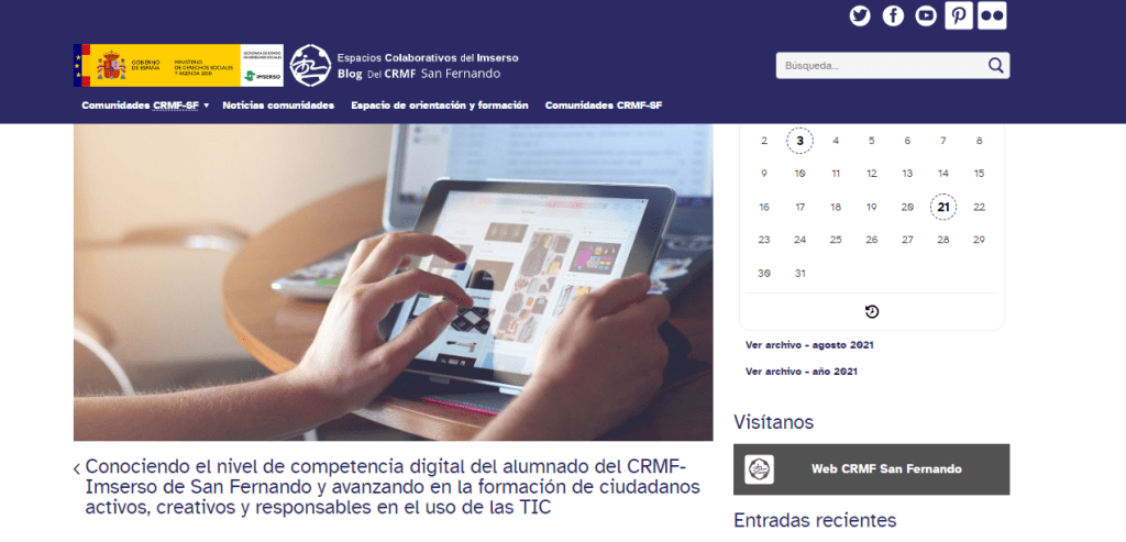En el Blog del CRMF-Imserso de San Fernando, también durante este periodo 2020-2021, fuimos publicando y dejando evidencias del proceso de trabajo seguido. Tristemente,el acceso al Blog como a las Comunidades está suprimido o interrumpido, al menos desde marzo del 2023, como ya he explicado en la página "Embajadora digital del CRMF-SF". A través de estas publicaciones, los compañeros de otros Centros del Imserso conocieron cómo estábamos arganizando nuestros programas formativos en línea, así como los recursos que estábamos utilizando. Mediante el feedback que recibimos de éstos compañeros que, igual que nosotros, se enfrentaban al reto de aportar soluciones a nuestros usuarios, aprendimos y nos enriquecimos mutuamente. Reconozco la satisfacción personal de «romper los muros» de nuestro Centro de trabajo, permitiéndonos compartir nuestros logros y dificultadescon colegas de otros Centros, por eso lamento tanto que contenidos valiosos que ya forman parte de la memoria colectiva del CRMF-San Fernando, se hayan ocultado o no se muestren en abierto.