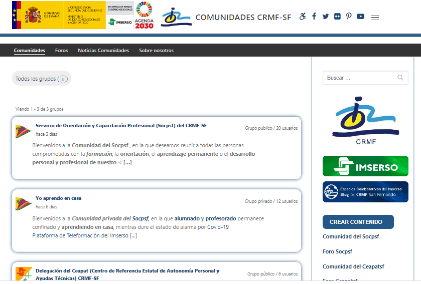 Actualmente,como hemos comentado antes, el acceso a las Comunidades del CRMF-SF está deshabilitado, lástima que tantas horas de trabajo, de varios profesionales, se hayan tirado a la papelera.😕